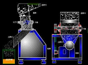 本机为立式粉碎机构,该机由机架、电机、进料斗和粉碎机构四个部件组成,物料经进料斗直接进入粉碎室,利用高速运转的活动齿盘和固定齿盘间的运动,使被粉碎物经齿冲击、剪切和摩擦及物料彼此间碰撞冲击等综合作用来达到粉碎物料的目的。通过调节动刀与定刀的间隙,控制所得颗粒的大小。通过筛网的控制将达到要求的颗粒从出料口排出,而未达到要求的物料在粉碎室内继续剪切粉碎,直至达到要求。